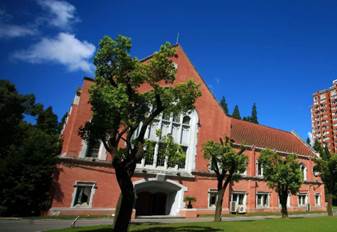 大禮堂與思魏堂為磚混結(jié)構(gòu)建筑,學(xué)院哥特式風(fēng)格。建筑立面上鑲嵌簡(jiǎn)化的哥特式十字花窗和尖券窗,窗洞用細(xì)柱分成豎向長(zhǎng)窗,增強(qiáng)了垂直感和立體感。建筑入口是厚墻線腳和雙聯(lián)扁平拱門(mén)洞。