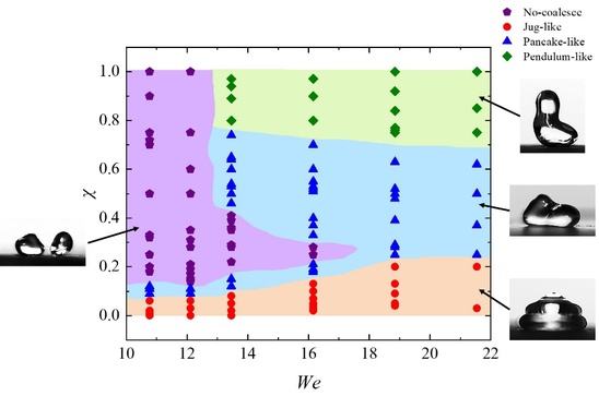 該論文基于實(shí)驗(yàn)從韋伯?dāng)?shù)與偏心率組成的二維參數(shù)空間內(nèi)劃分出了雙液滴融合后的壺型(jug-like)、餅型(pancake-like)、擺錘型(pendulum-like)三種基本反彈行為區(qū)域,并利用左右鋪展半徑分析其形成機(jī)理與特征。同時(shí)建立與驗(yàn)證了基于動(dòng)量守恒原理的平均最大鋪展半徑與韋伯?dāng)?shù)、偏心率的定量理論模型。研究工作得到了國(guó)家自然科學(xué)基金項(xiàng)目(12002212, 11872283)和上海市英才揚(yáng)帆計(jì)劃(20YF1432800)的資助。
