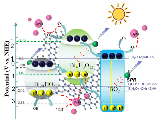 柔性光催化碳納米纖維復(fù)合材料(Bi/BixTiyOz-TiO2/CNFs)光催化機(jī)制原理圖