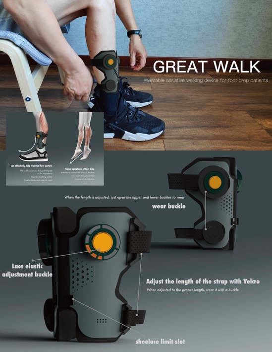 作品簡介:Great Walk是一款戶外行走輔助設備,專為因腰椎椎管狹窄導致神經(jīng)壓迫從而引發(fā)足下垂的患者設計。足下垂患者由于腳部控制神經(jīng)被壓迫,因此在行走時,腳尖無法自主抬起,落腳時腳尖先觸地,這種癥狀極大地增加了患者行走時的磕絆甚至摔倒的風險。Great Walk使用簡單、佩戴便捷、耐用性高,能有效幫助足下垂患者在行走中調節(jié)步態(tài),改善足下垂患者在行走中抬腳無法背屈、落腳時腳尖先觸地等癥狀,以此減少因足下垂病癥在行走中帶來的傷害與風險,該產(chǎn)品采用了非固定性的結構設計,非固定性的結構設計可以使踝關節(jié)和脛骨肌肉充分參與運動,有助于健康恢復,并且整體形態(tài)設計上與鞋子進行巧妙結合,在保證輔助行走功能的同時,減輕了產(chǎn)品佩戴負擔,能夠帶來輕松舒適的使用體驗。
