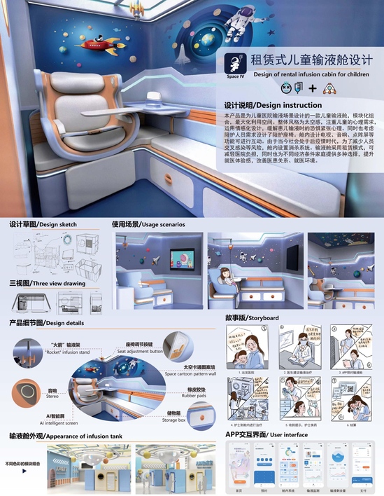 作品簡介:本產(chǎn)品選取兒童醫(yī)院輸液室場景進行輸液設備產(chǎn)品設計,將從智能設備租賃角度的醫(yī)療產(chǎn)品為設計切入點。由于當今社會處于后疫情時代,為了減少患兒交叉感染等風險,改善就診體驗感提出“輸液艙”概念,結合智能型輸液管理系統(tǒng)設計出一款“租賃式智能型兒童輸液艙”產(chǎn)品。這樣的獨立輸液空間概念發(fā)揮了其密閉性好、人員交叉感染率等特點,配合租賃的商業(yè)模式以給醫(yī)院降低負擔,給不同經(jīng)濟條件的病患提供多種選擇,改善就醫(yī)環(huán)境,提高就診體驗感。