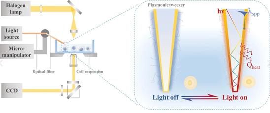 論文提出的等離激元鑷子表面由光纖耦合納米光纖探針、金膜、巰基化聚N-異丙基丙烯酰胺(PNIPAM-SH)溫敏水凝膠三層結(jié)構(gòu)組成。通過光纖導(dǎo)入的入射光激發(fā)金膜上的表面等離激元傳播并產(chǎn)生熱量以誘導(dǎo)溫敏水凝膠的相變,從而實現(xiàn)功能化溫敏表面和細(xì)胞膜之間的可逆結(jié)合,避免熱應(yīng)力和機(jī)械應(yīng)力。該技術(shù)結(jié)合微操作系統(tǒng)實現(xiàn)了溶液中單細(xì)胞的選擇性捕獲、自由移動和可控位置釋放,具有優(yōu)異的生物相容性、良好的平臺兼容性和低能耗、高靈活性等優(yōu)點。未來有望在單細(xì)胞分析、單細(xì)胞分選、細(xì)胞異質(zhì)性等多種單細(xì)胞研究中發(fā)揮作用。該文章受到威力(Wiley)旗下材料科學(xué)類期刊官方平臺Materials Views China報道。