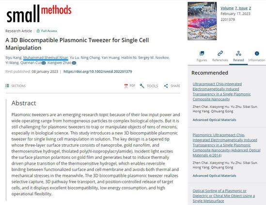 近日,中英國際學(xué)院教師Muhammad Shemyal Nisar博士以共同第一作者身份在國際期刊Small子刊Small Methods(中科院二區(qū),影響因子:15.367)發(fā)表了“用于單細(xì)胞操縱的生物相容性等離激元鑷子”(A 3D Biocompatible Plasmonic Tweezer for Single Cell Manipulation)的研究成果,提出了一種新的生物相容性等離激元鑷子,能實現(xiàn)溶液中單個細(xì)胞的三維操縱。