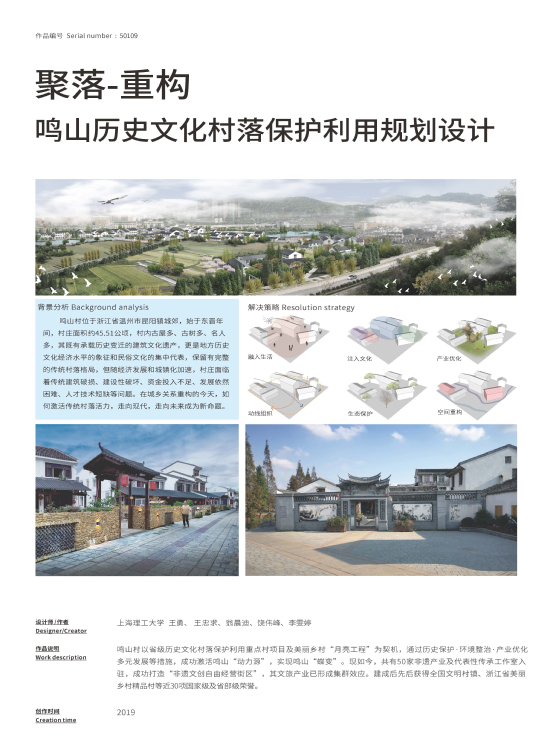 2016年,中共浙江省委、省政府將鳴山村列為省級歷史文化保護(hù)利用重點(diǎn)村,版藝學(xué)院環(huán)境設(shè)計(jì)團(tuán)隊(duì)?wèi)?yīng)邀承擔(dān)整村創(chuàng)意設(shè)計(jì),由王勇教授領(lǐng)銜的設(shè)計(jì)團(tuán)隊(duì)連續(xù)6年帶領(lǐng)六屆學(xué)生深入現(xiàn)場調(diào)研,根據(jù)鳴山村自然資源稟賦及甌瓷與陸游的傳說,以“一山、兩帶、三片區(qū)、七院落”重構(gòu)山、水、巷、院空間并賦予其詩畫意境,打造“傳奇古村,詩畫鳴山”的品牌主題,實(shí)現(xiàn)歷史保護(hù)、產(chǎn)業(yè)激活、多元發(fā)展的總目標(biāo)。以鳴山村為選題的畢業(yè)設(shè)計(jì)作品獲得首屆全國鄉(xiāng)村規(guī)劃設(shè)計(jì)二等獎(jiǎng),并獲得上海高校的最好成績。經(jīng)過6年跟蹤設(shè)計(jì),目前已經(jīng)建成鳴山陶院、鄉(xiāng)村博物館、靈犀閣等主題院落及村民廣場、村民中心等設(shè)施,培育了非遺文化產(chǎn)業(yè)街,為鳴山村創(chuàng)造2000多萬元集體收入,并獲得國家文旅部鄉(xiāng)村文化和旅游支持項(xiàng)目,中央農(nóng)辦、中宣部、農(nóng)業(yè)農(nóng)村部等領(lǐng)導(dǎo)和專家先后考察鳴山村。3月3日,團(tuán)隊(duì)承擔(dān)的第六期鳴山村入口形象設(shè)計(jì)項(xiàng)目順利通過評審,進(jìn)入實(shí)施階段。