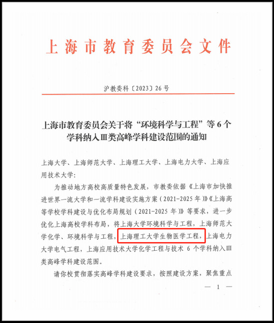 近日,上海市教委印發(fā)《上海市教育委員會關(guān)于將“環(huán)境科學(xué)與工程”等6個(gè)學(xué)科納入Ⅲ類高峰學(xué)科建設(shè)范圍的通知》(滬教委科〔2023〕26號),我校生物醫(yī)學(xué)工程學(xué)科成功入選教委Ⅲ類高峰學(xué)科。