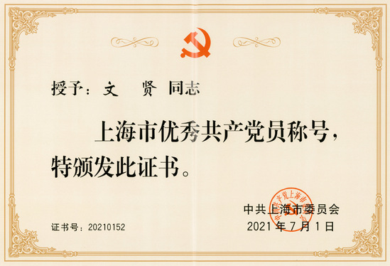2021年7月獲評上海優(yōu)秀共產(chǎn)黨員榮譽(yù)稱號