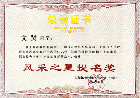 獲評2022年上海市第二屆高校大學(xué)生士兵風(fēng)采展風(fēng)采之星提名獎(jiǎng)