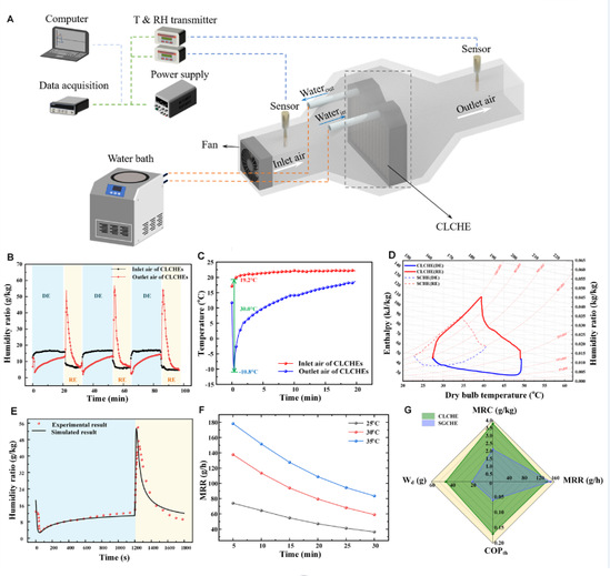 該論文通過復(fù)合可得然膠基質(zhì)和吸濕性鹽氯化鋰制備得到新型高效復(fù)合材料——可得然復(fù)合凝膠,對其進(jìn)行了等溫吸附、動態(tài)吸附以及循環(huán)測試。在相對濕度30% 以及溫度 30℃的低濕度條件下,可得然復(fù)合凝膠的吸附能力高達(dá)2.65 g/g,吸附速率系數(shù)k達(dá)到1.84 × 10-4 s-1,并且表現(xiàn)出良好的循環(huán)穩(wěn)定性。此外,團(tuán)隊基于優(yōu)化后的材料,制備成本低廉,制造簡單的凝膠基除濕換熱器CLCHE,以及搭建針對CLCHE的除濕性能測試實驗臺并進(jìn)行實驗測試。CLCHE在吸附-解吸循環(huán)周期中具有較好的穩(wěn)定性,通過僅15㎜的CLCHE通道,其進(jìn)出口空氣的露點溫度差能夠達(dá)到30℃,具有強(qiáng)大的深度除濕潛力。