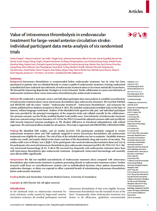 近年來(lái),隨著深入開(kāi)展臨床研究,動(dòng)脈取栓已被認(rèn)為是前循環(huán)大血管閉塞性急性缺血性卒中的最有效標(biāo)準(zhǔn)治療方法。這一方法明顯改善患者的臨床結(jié)局并減少殘留癥狀,但是否需要在動(dòng)脈取栓(EVT)之前進(jìn)行靜脈溶栓(IVT)一直存在國(guó)際爭(zhēng)議,因?yàn)?span style="text-indent:28px;text-wrap:wrap;">靜脈溶栓可能增加出血風(fēng)險(xiǎn)、延遲取栓時(shí)間并增加治療成本等問(wèn)題。因此,全球各地的研究人員紛紛展開(kāi)高質(zhì)量的臨床研究以解決這一問(wèn)題。到目前為止,全球已有六項(xiàng)關(guān)于這一問(wèn)題的高質(zhì)量臨床研究發(fā)表在國(guó)際著名期刊上。然而,由于這些研究在設(shè)計(jì)、入組數(shù)量、研究人群和基線數(shù)據(jù)等方面存在差異,六項(xiàng)研究的結(jié)果并不一致。因此,迫切需要進(jìn)行基于高質(zhì)量的隨機(jī)對(duì)照試驗(yàn)研究(RCT)個(gè)體數(shù)據(jù)的綜合分析,以獲得更高級(jí)別的循證醫(yī)學(xué)證據(jù),這將有助于指導(dǎo)全球卒中治療實(shí)踐。