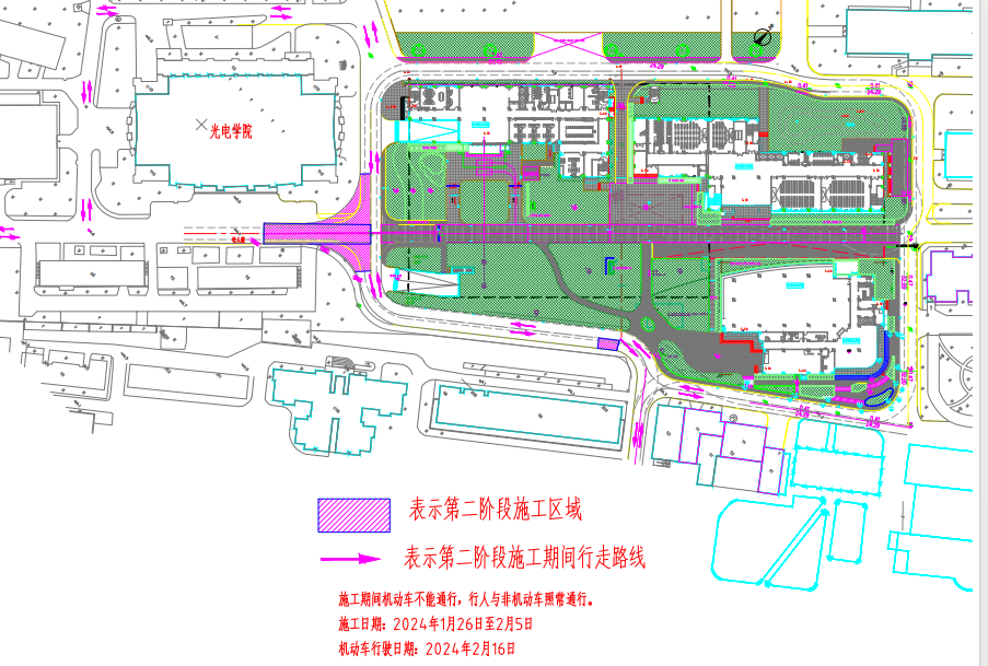 道路施工及養(yǎng)護(hù)時間段,機動車不可通行,預(yù)計通行開放時間為2月16日;工程施工給在校工作和學(xué)習(xí)、生活的師生們帶來不便,敬請諒解。