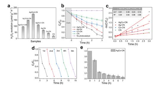 通過原位生成過氧化氫來構(gòu)筑光Fenton催化反應(yīng),為污染物處理提供了一條有效路徑。為此,廉孜超等人使用高密度原子分散的碳酸銀雙位點(diǎn)嵌入石墨相氮化碳(AgCo-CN)光催化劑,提出了一種高效的光自Fenton反應(yīng),用于降解污染物。AgCo-CN中的Ag和Co雙位點(diǎn)分別在加速光誘導(dǎo)電荷分離和形成自Fenton氧化還原中心方面起著關(guān)鍵作用,AgCo-CN具備有效的降解途徑,活性氧的協(xié)同作用實(shí)現(xiàn)了苯酚的完全礦化,AgCo-CN表現(xiàn)出優(yōu)異的光催化降解性能和長期活性。該研究為設(shè)計(jì)高效的光催化劑光自Fenton反應(yīng)奠定了基礎(chǔ),對(duì)于開發(fā)新型污水處理方法具有重要的借鑒意義。