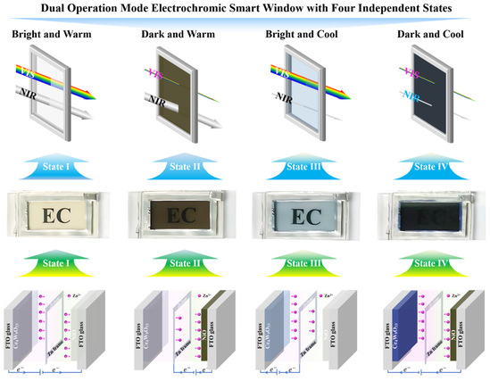 此外,在研究過(guò)程中,團(tuán)隊(duì)還有新的發(fā)現(xiàn):為了滿足不同地域和季節(jié)的不同氣候條件及不同個(gè)體喜好,人們希望建筑物、汽車、飛機(jī)等居住或出行空間具備智能調(diào)光和隔熱的功能,這要求窗戶能夠?qū)梢?jiàn)光與近紅外光進(jìn)行有效的獨(dú)立調(diào)控,目前傳統(tǒng)電致變色智能窗仍不能滿足這一要求。為此,馬董云、王金敏等與山東大學(xué)李海增設(shè)計(jì)并制備了一種新型的雙金屬氧化物——鎢酸鈰(Ce4W9O33)薄膜,利用表面電容控制機(jī)制誘導(dǎo)的表面等離子體共振效應(yīng)實(shí)現(xiàn)了對(duì)近紅外光的獨(dú)立調(diào)控。該薄膜可在不同電壓下呈現(xiàn)亮暖、亮冷和暗冷三種模式,而且展現(xiàn)出較大的充放電容量和良好的倍率性能。為了進(jìn)一步實(shí)現(xiàn)對(duì)可見(jiàn)光與近紅外光的完全獨(dú)立調(diào)控,團(tuán)隊(duì)將鎢酸鈰薄膜電極與金屬鋅和氧化鎳薄膜電極構(gòu)建了一種獨(dú)特的三電極器件,實(shí)現(xiàn)了對(duì)可見(jiàn)光與近紅外光的完全獨(dú)立調(diào)控,該器件可在不同電壓下呈現(xiàn)亮暖、亮冷、暗暖和暗冷四種獨(dú)立模式。相關(guān)研究以“基于鎢酸鈰電極的具有四種控制模式的電致變色器件可實(shí)現(xiàn)可見(jiàn)光與近紅外光的智能調(diào)控”(Quadruple Control Electrochromic Devices Utilizing Ce4W9O33 electrodes for Visible and Near-Infrared Transmission Intelligent Modulation)為題發(fā)表在《先進(jìn)科學(xué)》(Advanced Science)上 ,馬董云老師為第一作者,王金敏教授與山東大學(xué)李海增教授為共同通訊作者,上海理工大學(xué)為第一通訊單位。
