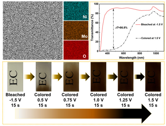 團(tuán)隊(duì)在研究過(guò)程中發(fā)現(xiàn),目前絕大部分金屬氧化物電致變色材料通電后著色態(tài)呈藍(lán)色,褪色態(tài)可達(dá)到無(wú)色透明,但藍(lán)色是冷色調(diào),長(zhǎng)時(shí)間面對(duì)會(huì)讓使用者產(chǎn)生憂郁情緒。而氧化鎳(NiO)通電后可以在棕黑色和淡黃色之間變化,棕色是一種中性色調(diào),但其色中性不夠好,導(dǎo)致褪色態(tài)不能達(dá)到無(wú)色透明的完全褪色狀態(tài)。為此,馬董云、王金敏等通過(guò)溶劑熱法在導(dǎo)電玻璃基底上直接生長(zhǎng)了一種新型的鉬酸鎳(NiMoO4)電致變色薄膜,具備優(yōu)異的導(dǎo)電性和顯著的電化學(xué)儲(chǔ)能特性,可以實(shí)現(xiàn)從透明到深棕色的中性著色,并具有超大的光調(diào)制幅度、優(yōu)異的循環(huán)穩(wěn)定性和良好的電化學(xué)儲(chǔ)能特性。此外,研究團(tuán)隊(duì)還構(gòu)建了基于鉬酸鎳電致變色薄膜的電致變色器件。相關(guān)研究以“具有超大光調(diào)制幅度的鉬酸鎳電致變色儲(chǔ)能薄膜及器件”(Porous NiMoO4 Nanosheet Films and a Device with Ultralarge Optical Modulation for Electrochromic Energy-Storage Applications)為題發(fā)表在《納米快報(bào)》(Nano Letters) 上,馬董云老師為第一作者,王金敏教授與山東大學(xué)李海增教授為共同通訊作者,上海理工大學(xué)為第一通訊單位。
