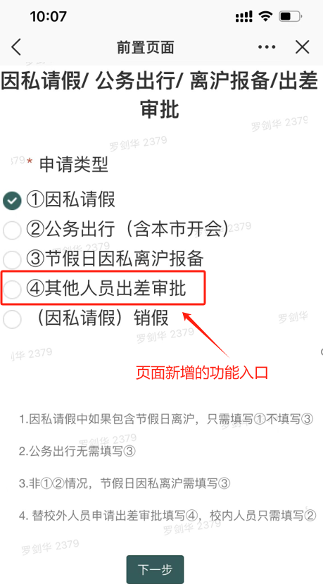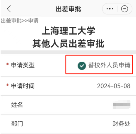 在“因私請(qǐng)假”銷假前新增了“④其他人員出差審批”的入口,老師如果幫校外人員申請(qǐng),可通此項(xiàng)進(jìn)行操作。原“其他人員出差審批”單獨(dú)入口已撤銷。