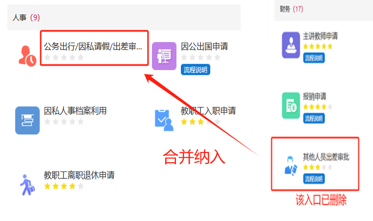 將“其他人員出差審批”功能整合至“公務(wù)出行/因私請(qǐng)假/出差審批”模塊中。