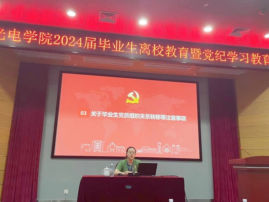 為推動黨紀(jì)學(xué)習(xí)教育走深走實(shí),加強(qiáng)畢業(yè)生黨員離校教育,6月14日下午,光電學(xué)院開展主題為“崇廉敬紀(jì)守初心,逐夢青春啟新程”的畢業(yè)生黨員離校教育暨黨紀(jì)學(xué)習(xí)教育。學(xué)院全體畢業(yè)生黨員和預(yù)備黨員參加教育。