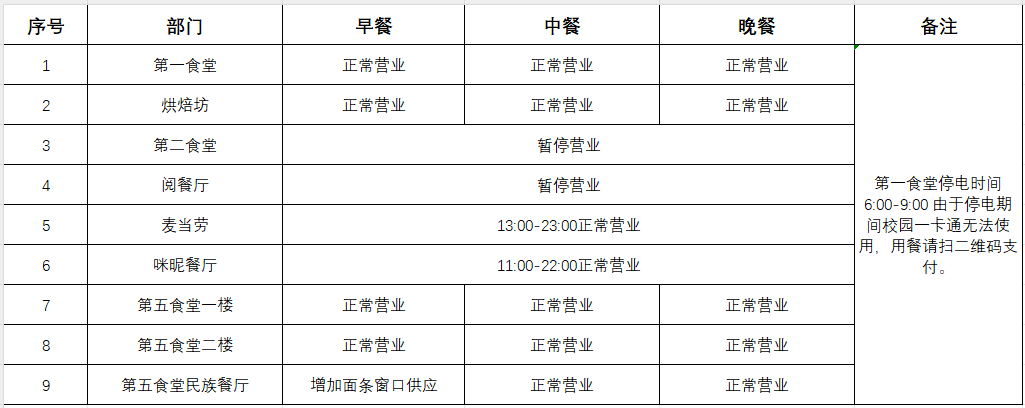 由于10月13日、10月20日學(xué)校電力設(shè)施切換,470號-580號校區(qū)部分樓宇停電,食堂營業(yè)時間部分調(diào)整,請大家相互轉(zhuǎn)告,停電期間第一食堂早餐保溫如有不到位,給同學(xué)帶來不便,敬請諒解!