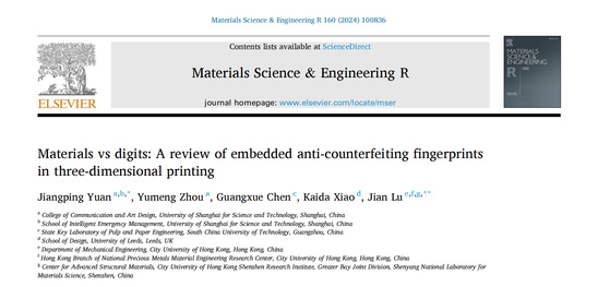 我校出版學(xué)院智能設(shè)計(jì)與3D打印課題組聯(lián)合香港城市大學(xué)呂堅(jiān)院士(教授)、華南理工大學(xué)陳廣學(xué)教授及英國利茲大學(xué)肖開達(dá)研究員在《材料科學(xué)與工程報(bào)告》(Materials Science & Engineering R)發(fā)表題為“材料與數(shù)字: 嵌入式3D打印技術(shù)方法新突破”(Materials vs digits: A review of embedded anti-counterfeiting fingerprints in three-dimensional printing)的綜述研究文章,出版學(xué)院青年教師袁江平博士為該論文第一作者及第一通訊作者,在讀碩士生周雨萌為第二作者,呂堅(jiān)院士為共同通訊作者,上海理工大學(xué)為第一單位。
