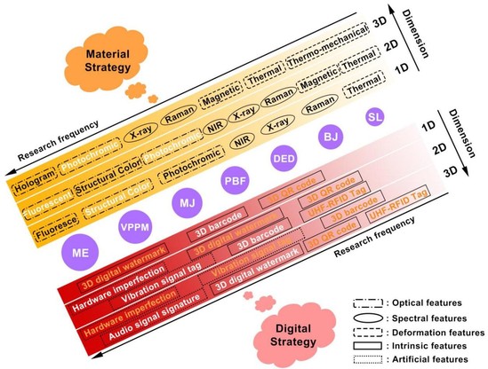 隨著功能性打印材料開發(fā)不斷取得突破,促進(jìn)了3D打印深度產(chǎn)業(yè)化,與此同時(shí),防止3D打印產(chǎn)品被篡改、偽造和破壞等核心挑戰(zhàn)攻克也日益迫切。平面印刷品的防偽技術(shù)由來已久,但其方法并不普適于3D打印產(chǎn)品,因?yàn)?D打印產(chǎn)品的防偽特征嵌入方式有本質(zhì)區(qū)別。該研究論文系統(tǒng)性梳理了平面印刷品及3D打印產(chǎn)品的防偽技術(shù)及應(yīng)用,提出了基于材料響應(yīng)特性和三維數(shù)字信息的兩種3D打印嵌入策略,并全面剖析了不同成型原理下3D打印內(nèi)嵌式防偽方法的優(yōu)缺點(diǎn)。