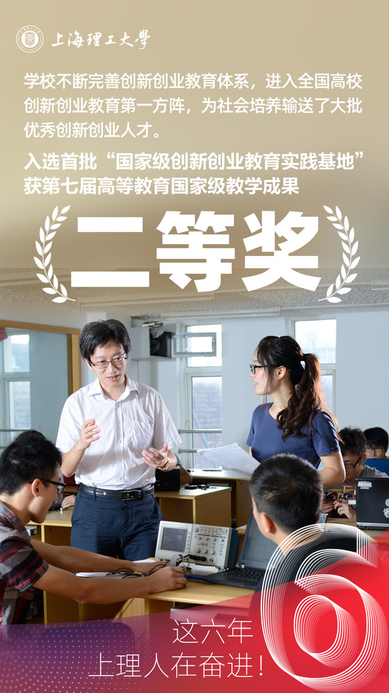這六年,上海理工大學(xué)不斷完善創(chuàng)新創(chuàng)業(yè)教育體系,進(jìn)入全國高校創(chuàng)新創(chuàng)業(yè)教育“第一方陣”,為社會(huì)培養(yǎng)輸送了大批優(yōu)秀創(chuàng)新創(chuàng)業(yè)人才。入選首批“國家級(jí)創(chuàng)新創(chuàng)業(yè)教育實(shí)踐基地”,獲第七屆高等教育國家級(jí)教學(xué)成果二等獎(jiǎng)。