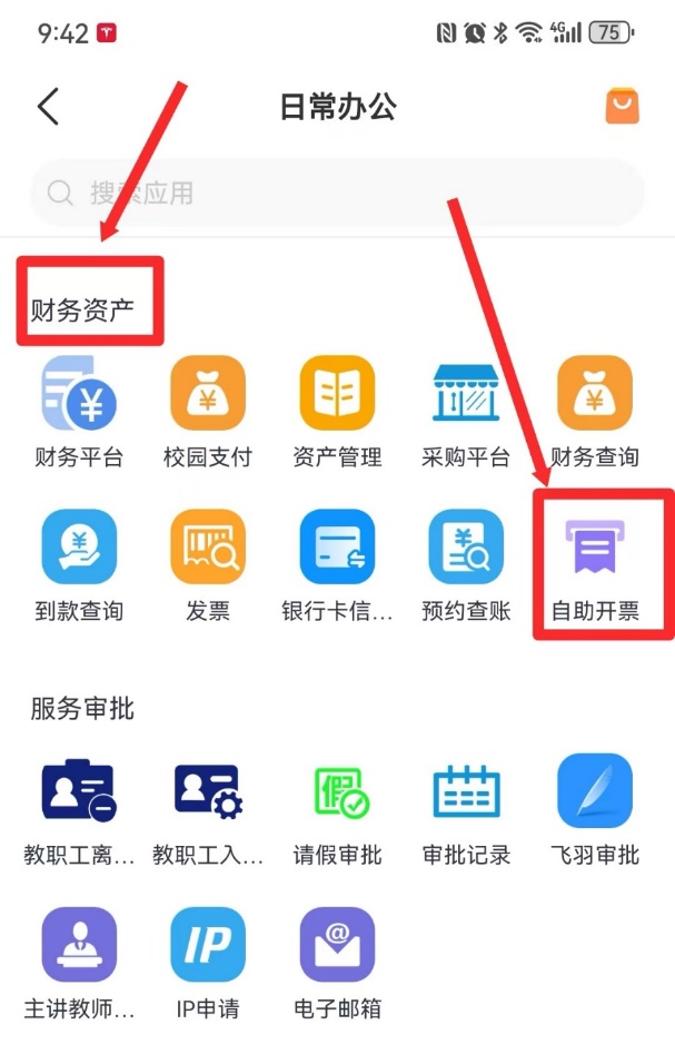 登錄信息門戶,點擊“財務資產(chǎn)”“+”,進入應用中心頁面,選擇“自助開票平臺”;移動端Welink中,搜索 “自助開票”,或進入日常辦公,在“財務資產(chǎn)” 中,點擊“自助開票” 。