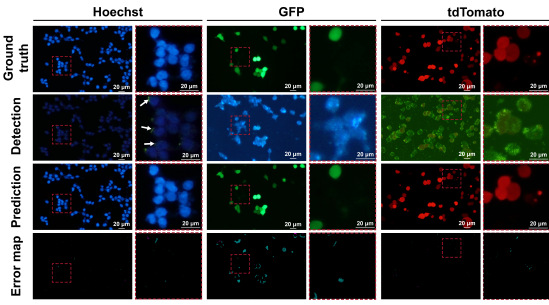 團隊從AI技術(shù)出發(fā),開發(fā)了“數(shù)字虛擬濾波器(digital optical filter)”,提出了無濾波熒光顯微成像技術(shù)。使用該技術(shù)的熒光顯微成像系統(tǒng),可完全摒棄昂貴的熒光濾波元件,通過暗場照明方式,減弱背景噪聲。成像系統(tǒng)獲取圖像后,通過神經(jīng)網(wǎng)絡(luò),自動選擇熒光通道,準(zhǔn)確預(yù)測熒光信號。結(jié)果表明,無濾波熒光顯微成像系統(tǒng)具有良好的魯棒性,對不同顯微放大倍率、熒光染料濃度、樣品種類,均能高效、精準(zhǔn)地還原出熒光信號,實現(xiàn)高靈敏、高特異性熒光成像。