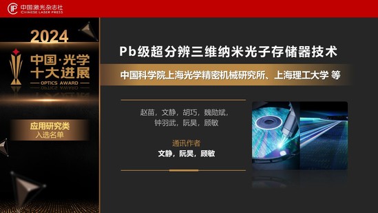 3月29日晚,中國(guó)激光雜志社重磅發(fā)布“2024中國(guó)光學(xué)十大進(jìn)展”。經(jīng)過(guò)評(píng)審委員會(huì)多輪遴選,“Pb級(jí)超分辨三維納米光子存儲(chǔ)器技術(shù)”入選“2024中國(guó)光學(xué)十大進(jìn)展”(應(yīng)用研究類),并位列第一。