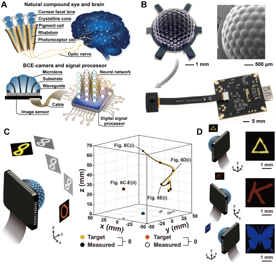 仿生視覺(jué)系統(tǒng)及成像效果。A 節(jié)肢動(dòng)物視覺(jué)系統(tǒng)和仿生視覺(jué)系統(tǒng);B 仿生復(fù)眼及視覺(jué)系統(tǒng)的實(shí)物圖;C,D利用仿生視覺(jué)系統(tǒng)進(jìn)行目標(biāo)成像和定位