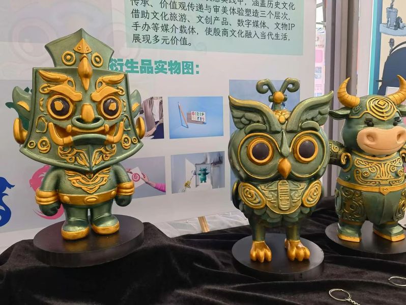 這種文化自信在多件作品中形成共振:胡夢欣同學的《“千燈愿”品牌設計》以高飽和色系重構秦淮燈彩,讓傳統(tǒng)燈會轉(zhuǎn)化為可傳播的視覺符號;裘澤棟同學的《再現(xiàn)殷商》將殷墟博物館青銅器亞長牛尊、婦好鸮面,尊、亞長銅鉞等器皿,通過對文物圖像的簡化抽象,創(chuàng)作了文物IP、手辦等衍生作品。