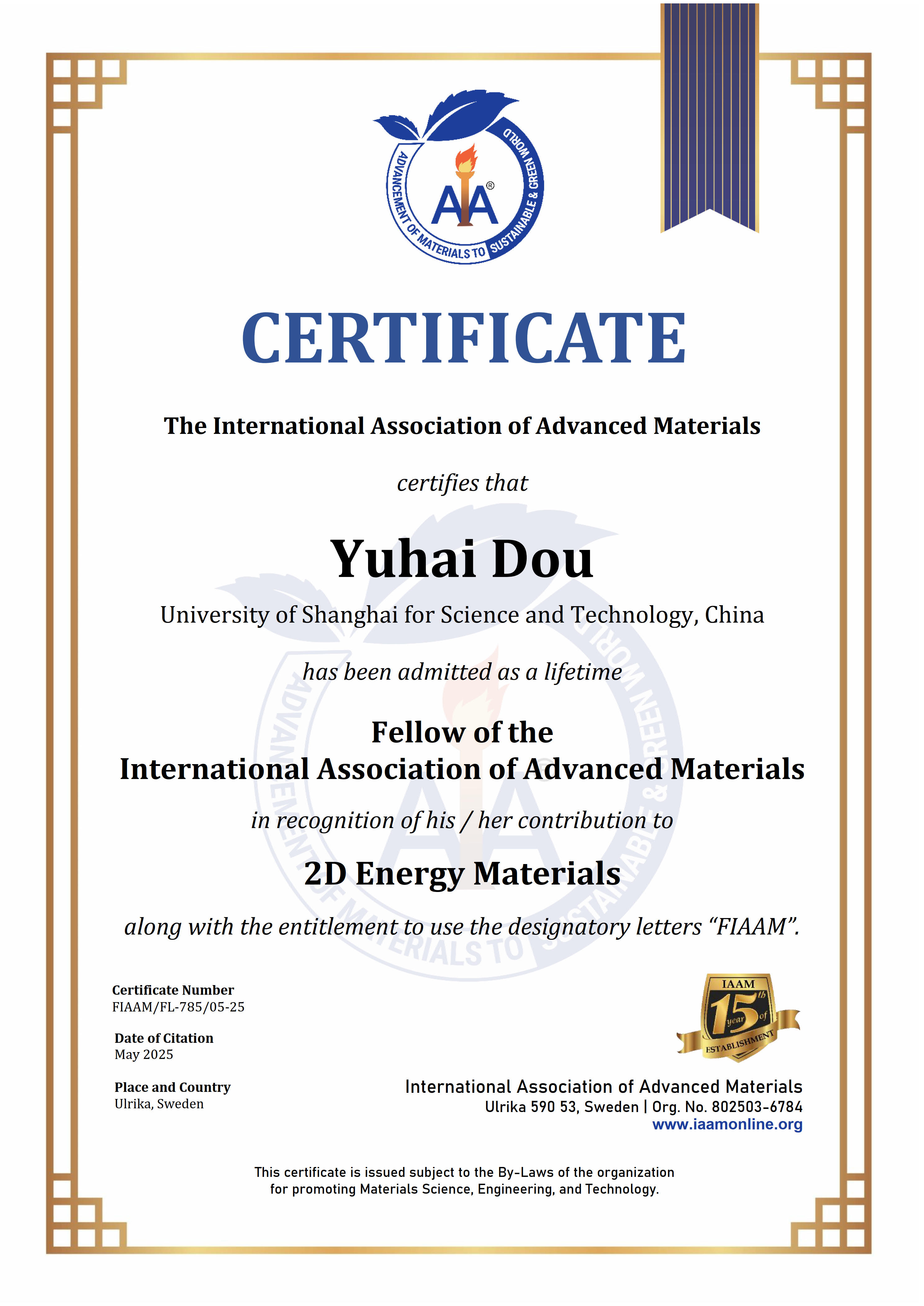 5月28日,上海理工大學(xué)能源材料科學(xué)研究院副院長竇玉海教授被國際先進(jìn)材料協(xié)會(huì)(IAAM, International Association of Advanced Materials)授予“終身會(huì)士”(Lifetime Fellow)榮譽(yù)稱號(hào),以表彰他在新能源材料領(lǐng)域,尤其在原子級(jí)超薄材料方向的前沿探索與貢獻(xiàn)。這是竇玉海教授繼2021年獲頒"IAAM青年科學(xué)家獎(jiǎng)?wù)拢↖AAM Young Scientist Medal)"后,該國際權(quán)威學(xué)術(shù)組織對其科研成就和貢獻(xiàn)的再度認(rèn)可。