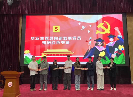 畢業(yè)生黨員向結(jié)對的新發(fā)展黨員贈送紅色書籍。一本本承載著紅色精神的書籍,傳遞的不僅是知識,更是紅色基因的傳承與接力。希望新發(fā)展黨員能從書中汲取力量,堅定理想信念,走好新時代的長征路。