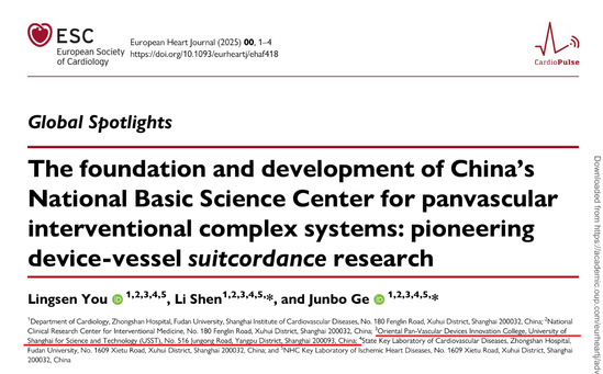近日,葛均波院士團(tuán)隊(duì)在國際頂級期刊《歐洲心臟雜志》(European Heart Journal,中科院一區(qū)TOP,影響因子35.6)發(fā)表了題為《國家基金委泛血管介入復(fù)雜系統(tǒng)基礎(chǔ)科學(xué)中心的建立與發(fā)展:開創(chuàng)器械-血管三大生態(tài)平衡與配和度研究》(The foundation and development of China’s National Basic Science Center for panvascular interventional complex systems: pioneering device-vessel suitcordance research)的重要研究成果。上海理工大學(xué)東方泛血管器械創(chuàng)新學(xué)院參與了該項(xiàng)研究,學(xué)院院務(wù)委員會主任葛均波院士、學(xué)院院務(wù)委員會委員沈靂教授為通訊作者。