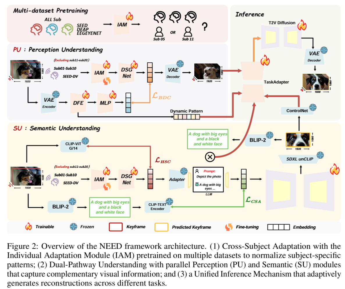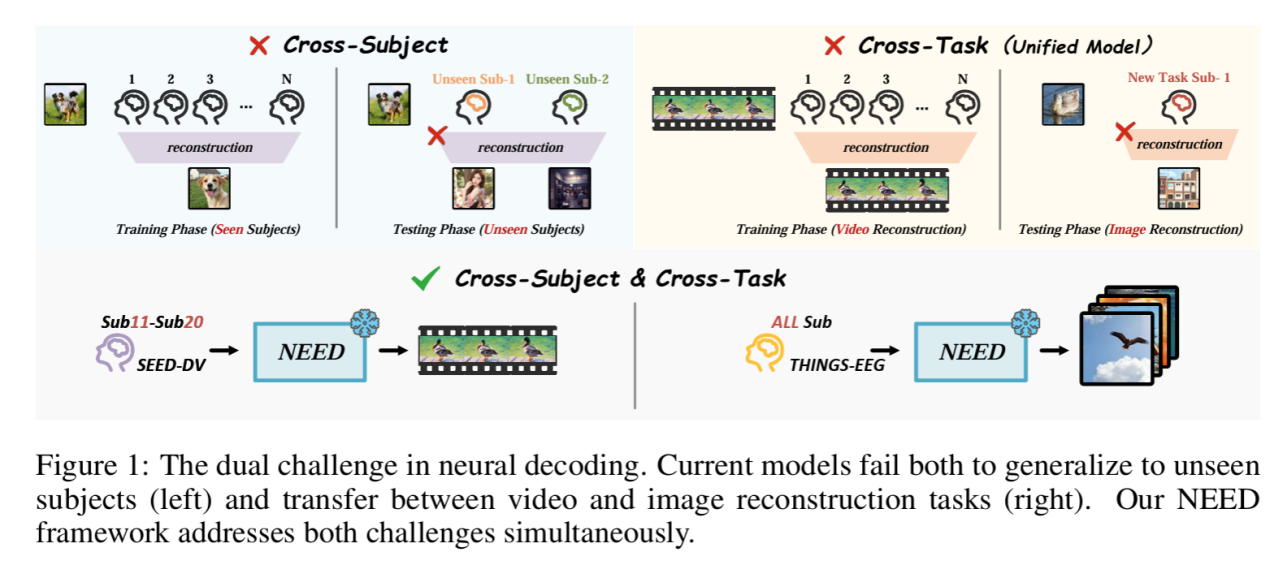 將大腦活動(dòng)轉(zhuǎn)化為有意義的視覺內(nèi)容長(zhǎng)期以來一直被認(rèn)為是神經(jīng)科學(xué)和腦機(jī)接口研究的基本挑戰(zhàn)。基于腦電圖的神經(jīng)解碼的最新進(jìn)展顯示出良好的前景,但該領(lǐng)域仍然存在兩個(gè)關(guān)鍵限制:跨受試者的泛化能力差以及對(duì)特定視覺任務(wù)的限制?;诖?,研究團(tuán)隊(duì)提出了NEED模型,是第一個(gè)實(shí)現(xiàn)了零樣本跨受試者和跨任務(wù)泛化的基于腦電圖的視覺重建統(tǒng)一框架。研究工作展示了神經(jīng)解碼如何跨越受試者和任務(wù)界限,為走向真正可推廣的腦機(jī)接口做出重要貢獻(xiàn)。
