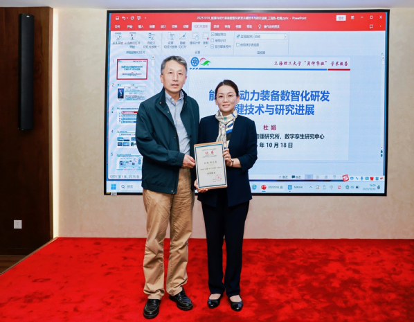 儀式結(jié)束后,中國科學院工程熱物理研究所數(shù)字孿生研究中心主任杜娟研究員以“能源與動力裝備數(shù)智化研發(fā)關(guān)鍵技術(shù)與研究進展”為主題作首場學術(shù)報告。劉寶林為其頒發(fā)首講報告證書。會后,與會嘉賓共同參觀了上海理工大學校史館,深入了解了學校百年辦學脈絡(luò)與工程教育傳統(tǒng)。