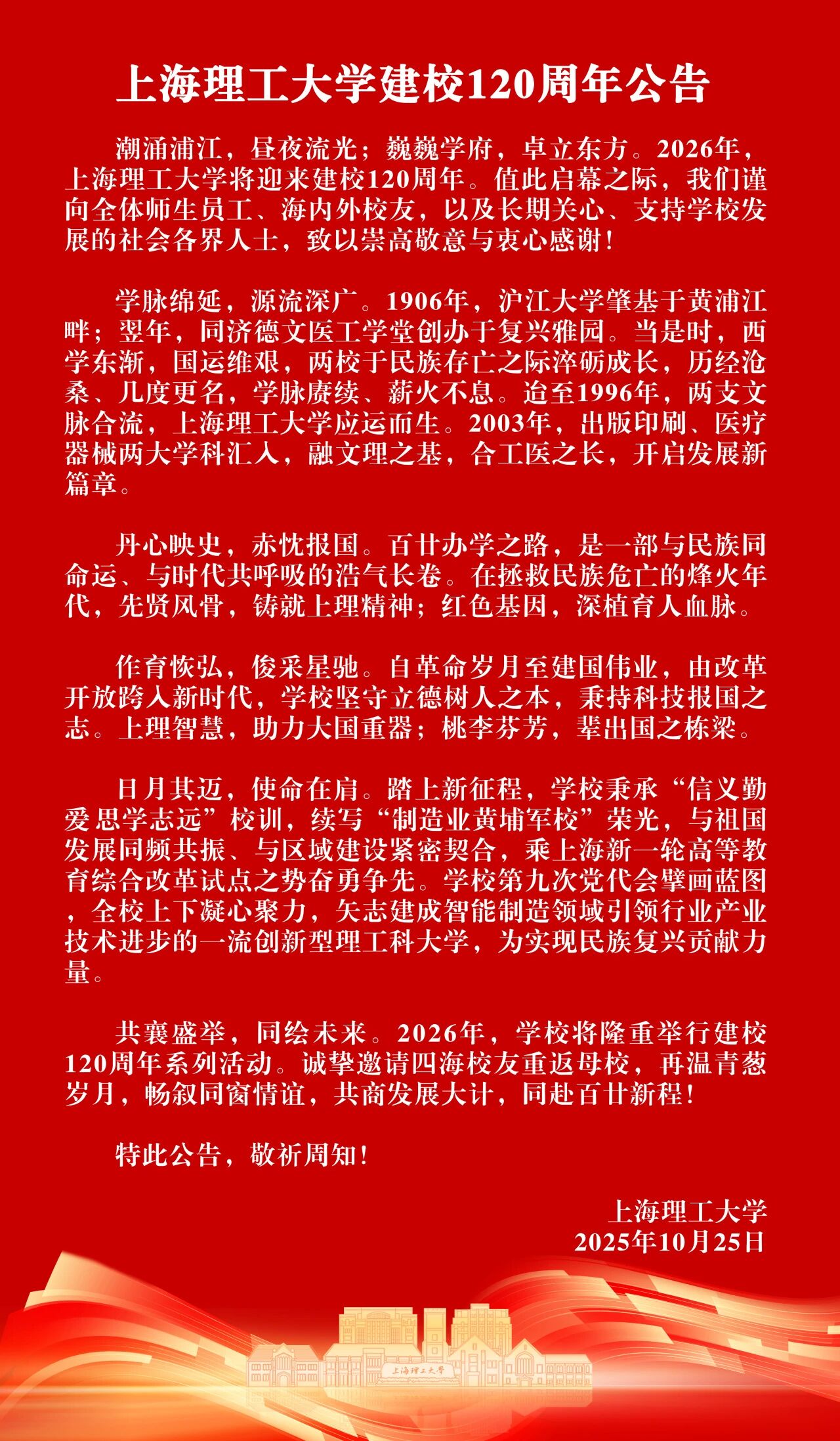 發(fā)布《上海理工大學(xué)建校120周年公告》
