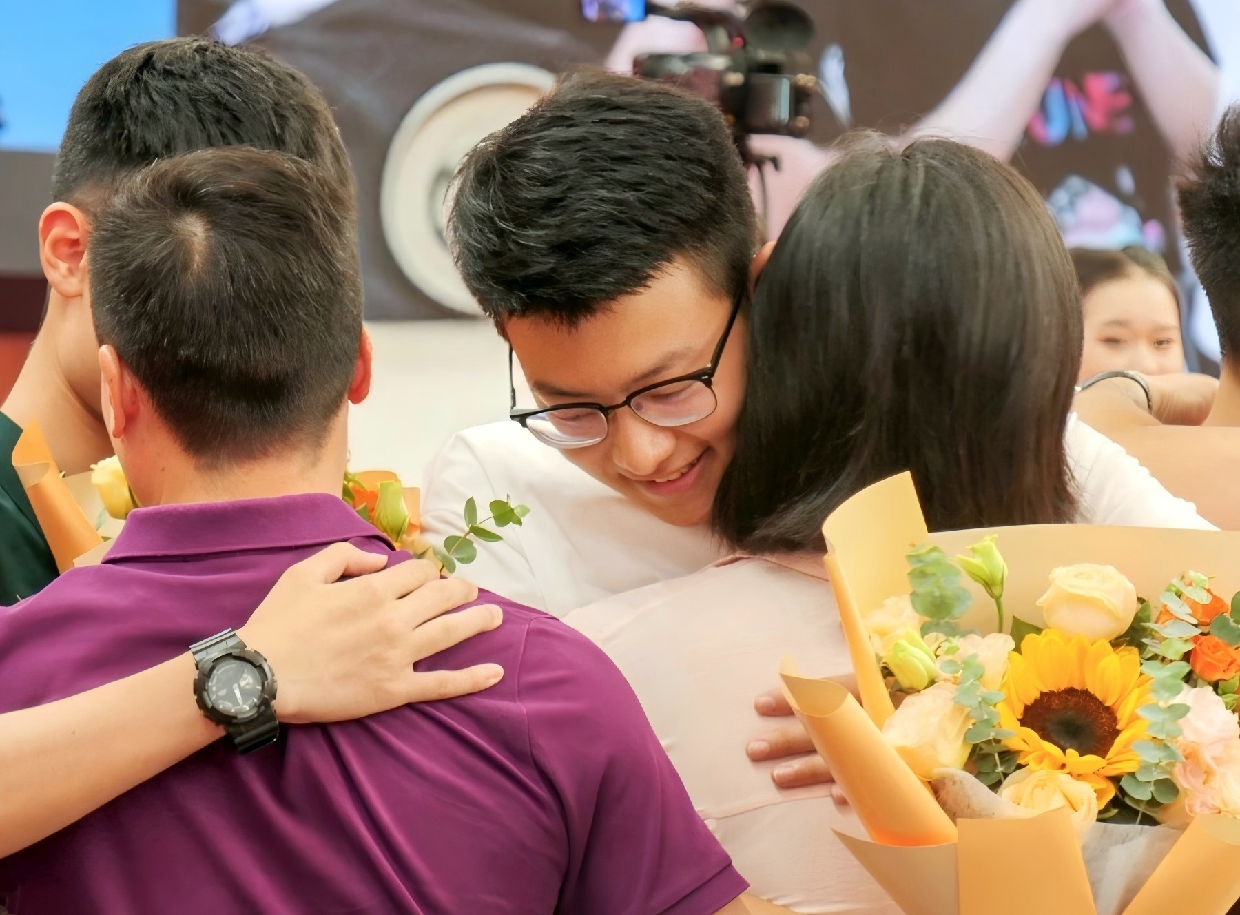 8月27日,上海交大2025級本科新生開學典禮邀請家長代表發(fā)言,學生在之后送上鮮花并和家人相擁