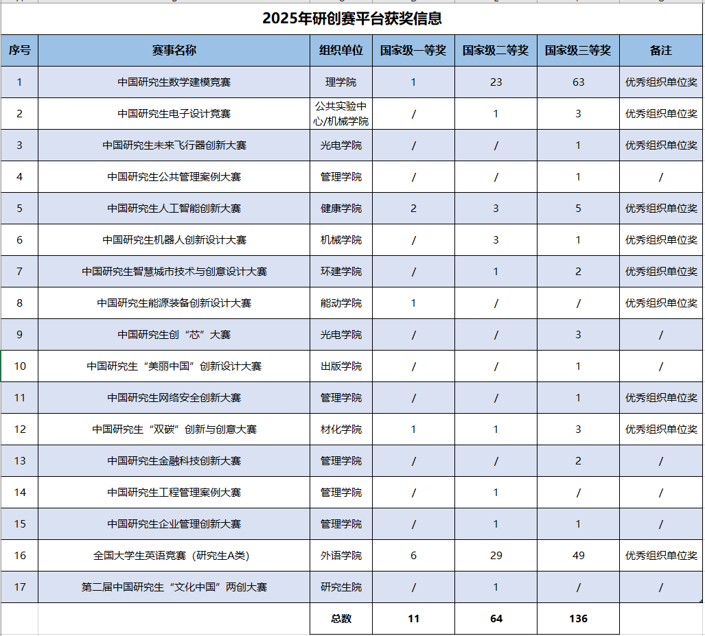 其中,理學(xué)院承辦的2025年“華為杯”第二十二屆中國研究生數(shù)學(xué)建模競賽,上理工共1341支隊(duì)伍參賽,最終獲一等獎(jiǎng)1項(xiàng)、二等獎(jiǎng)23項(xiàng)、三等獎(jiǎng)63項(xiàng),上理工獲“優(yōu)秀組織單位”和“先進(jìn)個(gè)人”榮譽(yù),并以得分第一位居“優(yōu)秀組織單位”榜首。能動學(xué)院、光電學(xué)院、管理學(xué)院、公共實(shí)驗(yàn)中心/機(jī)械學(xué)院、外語學(xué)院、環(huán)建學(xué)院、健康學(xué)院、理學(xué)院、材化學(xué)院等承辦的10個(gè)主題賽事獲“優(yōu)秀組織單位”獎(jiǎng)。其中,中國研究生智慧城市技術(shù)與創(chuàng)意設(shè)計(jì)大賽和中國研究生網(wǎng)絡(luò)安全創(chuàng)新大賽首次獲得“優(yōu)秀組織單位獎(jiǎng)”。中國研究生未來飛行器創(chuàng)新大賽、中國研究生公共管理案例大賽、中國研究生金融科技創(chuàng)新大賽、中國研究生“文化中國”兩創(chuàng)大賽等4個(gè)平臺實(shí)現(xiàn)了國獎(jiǎng)零的突破。中國研究生人工智能創(chuàng)新大賽、中國研究生能源裝備創(chuàng)新設(shè)計(jì)大賽、中國研究生“雙碳”創(chuàng)新與創(chuàng)意大賽等3個(gè)平臺實(shí)現(xiàn)了國家級一等獎(jiǎng)的突破。此外,在2025年全國大學(xué)生英語競賽中,我校研究生獲國家級一等獎(jiǎng)6人、二等獎(jiǎng)29人、三等獎(jiǎng)49人。