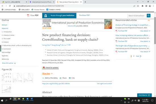 近日,管理學(xué)院劉斌教授團(tuán)隊(duì)在國(guó)際權(quán)威期刊《國(guó)際生產(chǎn)經(jīng)濟(jì)學(xué)期刊》(International Journal of Production Economics,中科院一區(qū),Top期刊,IF=11.251,ABS三星期刊,在運(yùn)籌學(xué)和管理科學(xué)領(lǐng)域期刊中排名第3/99)上發(fā)表論文《新產(chǎn)品融資決策:眾籌、銀行還是供應(yīng)鏈?》(New product financing decision: Crowdfunding, bank or supply chain?)。劉斌教授為該論文的通訊作者,博士生陳雨汀為第一作者(目前為清華大學(xué)博士后)。除銀行貸款外,供應(yīng)鏈融資已成為資金受限的企業(yè)可以從其上游或下游尋求資金幫助的一個(gè)方案,眾籌也被視為創(chuàng)新產(chǎn)品的一種新型融資來(lái)源,允許資金有限的制造商從一群投資者那里籌集初始資金。論文研究了當(dāng)新產(chǎn)品需要來(lái)自壟斷和資本充足的供應(yīng)商的關(guān)鍵組件時(shí),資本約束制造商的最優(yōu)融資策略,探討了不同融資策略下的最優(yōu)組件就緒時(shí)間和批發(fā)定價(jià)決策。研究發(fā)現(xiàn),在眾籌條件下,供應(yīng)商的最優(yōu)組件準(zhǔn)備時(shí)間總是晚于制造商的最優(yōu)預(yù)告時(shí)間。由于眾籌下的信息不對(duì)稱(chēng),制造商和供應(yīng)商都努力以較高的初始需求和較低的需求